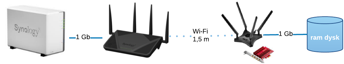 Testowanie portu USB 3.0 polegało na podłączeniu komputera do routera poprzez interfejs 1Gb. Nośnikiem danych w komputerze był ram dysk.Z drugiej strony routera, poprzez złącze USB 3.0, podłączony został dysk twardy dysk twardy WD MyPassport Ultra 1TB (jego test możecie przejrzeć tutaj). Potrafi on przy zapisie i odczycie przekraczać wartości 110 MB/s, więc jest dobrym nośnikiem testowym.