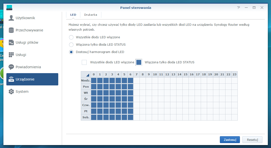 Możemy dzięki niej zdefiniować, czy wszystkie diody mają się świecić, czy tylko dioda Statusu urządzenia, bądź też dostosować je wg harmonogramu.